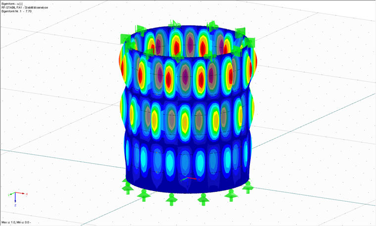 Il problema principale della verifica è quello di classificare i risultati ottenuti dal programma in uno dei tipici casi di instabilità. In questo caso, è molto semplice a causa del carico: Si tratta di pura instabilità da pressione del meridiano. Pertanto, vengono calcolati i parametri di instabilità indipendenti secondo l'Appendice D 1.2 in EN 1993-1-6 [3].