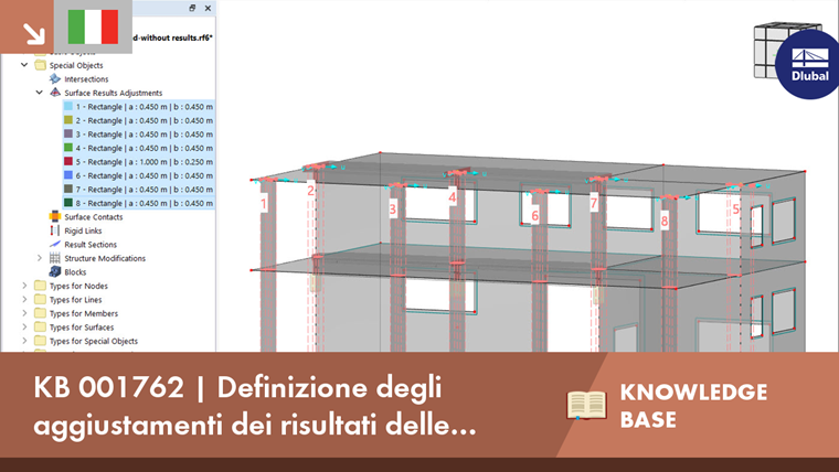 La funzione sopra menzionata è disponibile in "Oggetti speciali" nel navigatore Dati. Its use will be shown by defining surface results adjustments for the connection zones between the columns and the slabs in Image 2. The goal is to define areas corresponding to the dimensions of the column and to set to zero the surface internal forces within the zone.