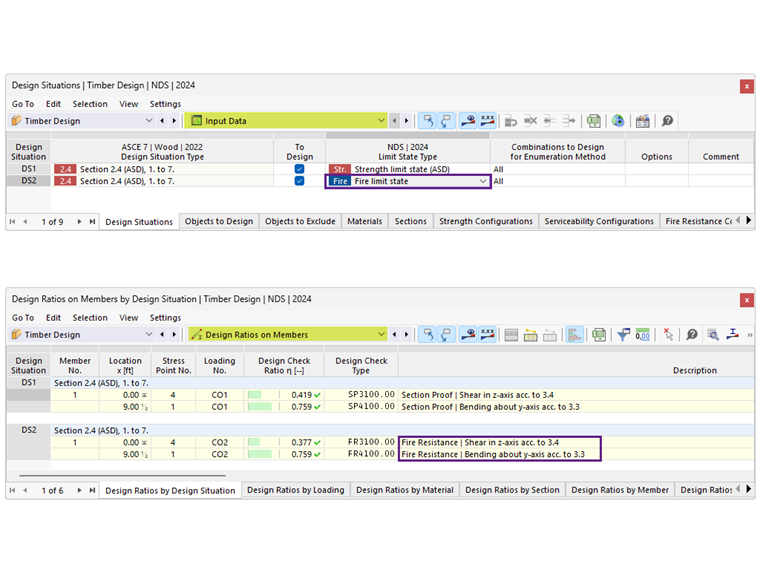 Per la situazione di progetto DS2, il tipo di stato limite è impostato su Stato limite di incendio per eseguire la verifica di incendio. Dopo aver eseguito il calcolo della verifica legno, vengono presentati i risultati per la verifica della resistenza e la resistenza al fuoco (Figura 03).