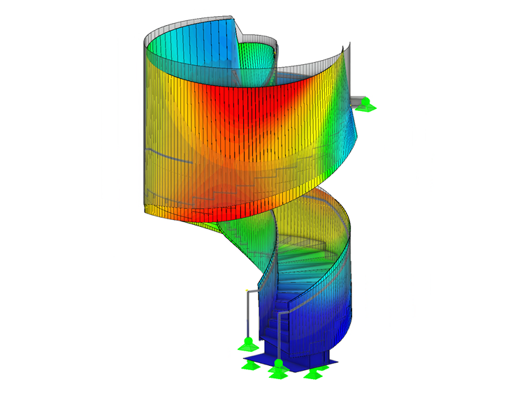I longheroni delle scale (che fungono anche da protezione contro la caduta) e i gradini sono realizzati in lamiera di acciaio t = 25 mm con una qualità di acciaio S275. L'altezza dei longheroni è di circa 1,4 m Per la progettazione in RFEM, sono stati usati gli add-on Verifica acciaio e Analisi di tensioni-deformazioni.