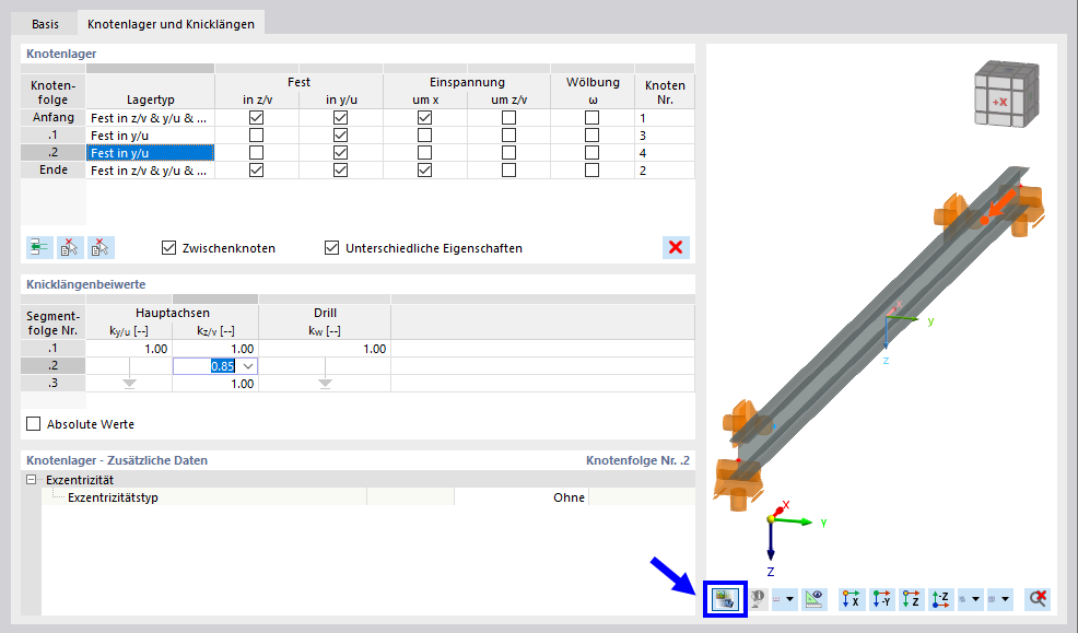 Finestra di dialogo "Nuove lunghezze libere d'inflessione", Definizione dei vincoli esterni dei nodi e delle lunghezze libere d'inflessione