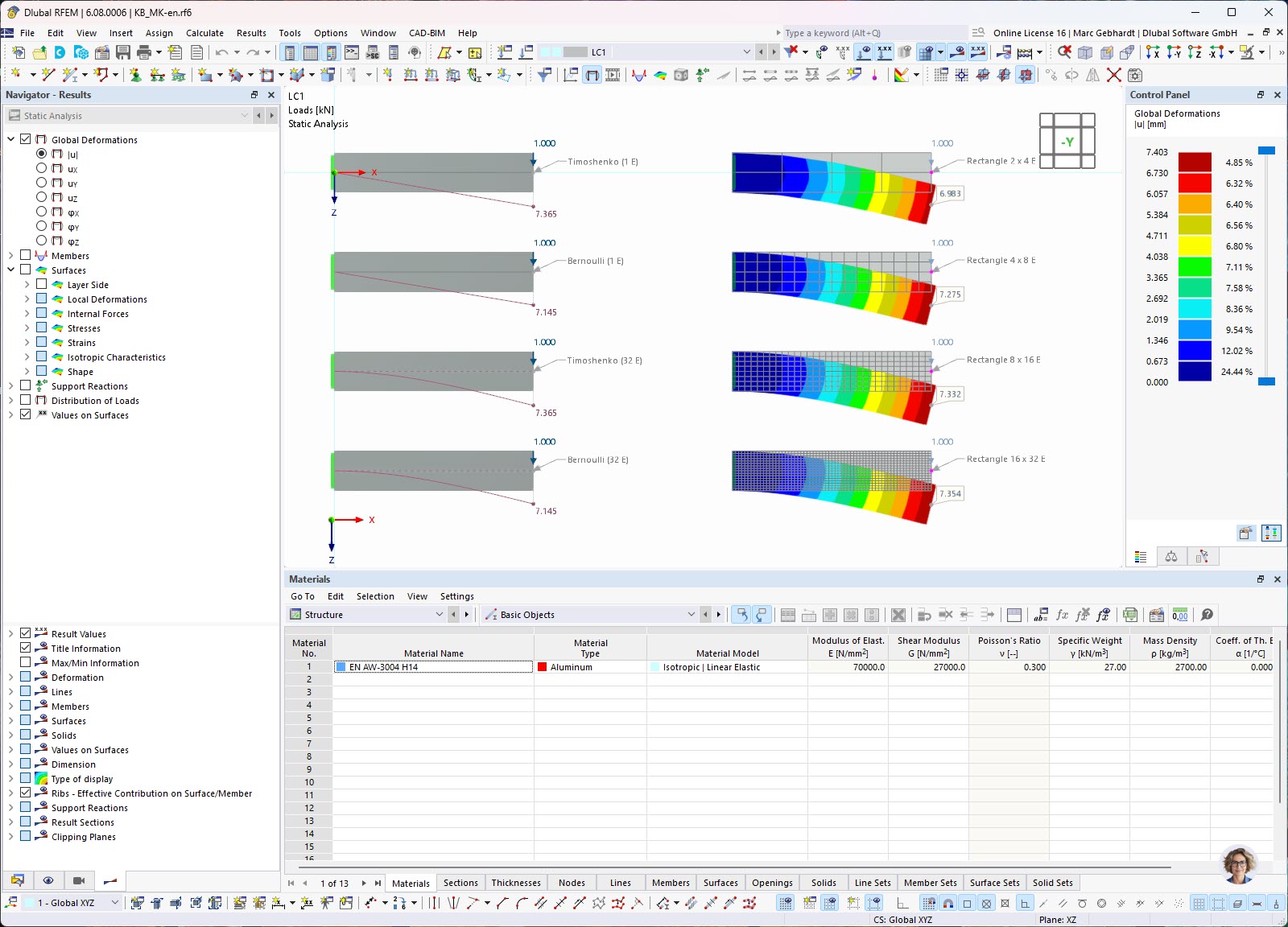 Obraz ilustruje studium konwergencji siatki w celu zbadania odkształcenia wspornika w różnych podejściach do modelowania. Takie badania są niezbędne w dziedzinie mechaniki konstrukcyjnej, aby zapewnić nośność budowli. Dzięki zastosowaniu rozwiązań software'owych, takich jak te od firmy Dlubal, inżynierowie mogą przeprowadzać złożone obliczenia, podejmując w ten sposób świadome decyzje dla zapewnienia stateczności elementów konstrukcyjnych. Dokładna symulacja rozkładu obciążeń i wynikających z nich odkształceń optymalizuje wymiarowanie elementów konstrukcyjnych i wykorzystanie materiałów, poprzez identyfikację i ocenę obszarów krytycznych.