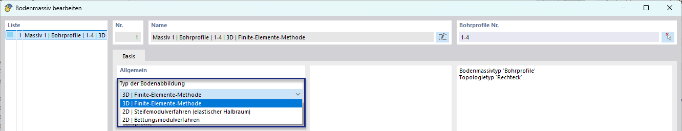 Die Liste des Dialoges enthält alle Bodenmassive, die im vorliegenden Modell vorhanden sind. Alle weiteren Felder des gesamten Eingabedialoges enthalten die Einträge für das Bodenmassiv das aktuell in der Liste angewählt ist.