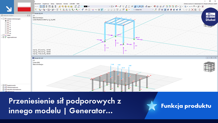 Ten generator obciążeń umożliwia importowanie sił reakcji podpór liniowych i węzłowych z innego modelu i zastosowanie ich jako obciążeń. W ten sposób modele można połączyć cyfrowo jako modele konstrukcyjne z wykazami elementów. Modele połączone są zarządzane w zakładce Modele zależne okna dialogowego Dane podstawowe' modelu.