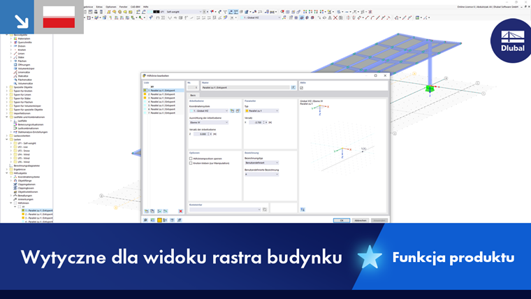 Za pomocą pola kontrolnego 'Zablokuj położenie linii referencyjnych' można sterować, czy linia referencyjna może być wybrana, edytowana lub przesuwana. Zablokowana linia referencyjna jest trwale umieszczona w oknie roboczym. W ten sposób nie przeszkadza przy wprowadzaniu obiektów modelu i nie można jej przypadkowo przesunąć czy usunąć.