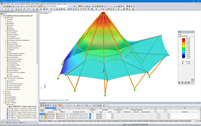 Dodatkowo, RFEM i RF-FORM FINDING zostały wykorzystane do dalszej analizy i projektowania konstrukcji, w tym do określenia kształtu rozciąganej tkaniny pod działaniem sił naprężenia wstępnego. Z kolei RF-TIMBER AWC zastosowano do zwymiarowania drewnianych elementów konstrukcji, zgodnie z normami amerykańskimi.