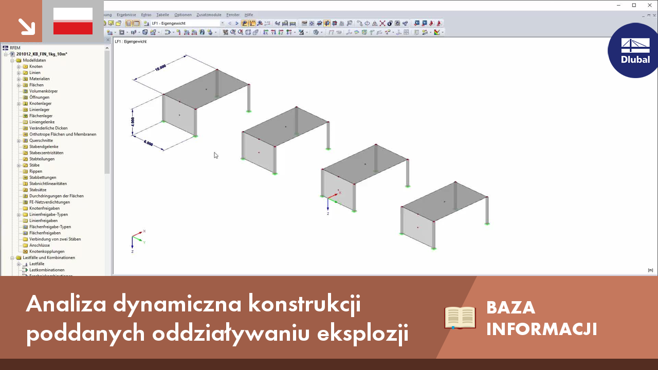 Ze względu na wspomnianą powyżej niezależność poszczególnych pięter schodów, modelowany jest tylko jeden odcinek schodów. Belki schodowe i elementy kotwiące są modelowane jako powłoki, stopnie schodowe jako pręty. Do szacowania maksymalnych naprężeń stopni szklanych oraz do oceny maksymalnych naprężeń stalowych belek schodowych używane są dwie różne wartości sztywności połączenia szklanego stopnia do belki konsoli wspierającej. Osadzenie w żelbecie modelowane jest jako nieefektywne w rozciąganiu elastyczne podłoże poszczególnych powierzchni elementu kotwiącego.