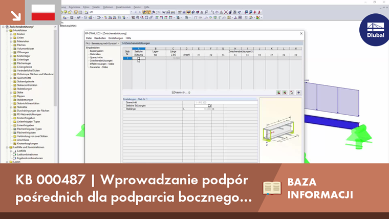 Jednak w zależności od modułu dodatkowego obsługa węzłów oferuje więcej opcji wprowadzania danych definiowanych przez użytkownika niż podpora pośrednia. W większości modułów dodatkowych podpora pośrednia jest stosowana jako podpora widełkowa z ograniczeniem przesunięcia bocznego i blokadą obrotu wokół osi podłużnej. W modułach dodatkowych RF-/STEEL EC3 i RF-/STEEL AISC istnieje jednak możliwość rozróżnienia pomiędzy podporą przegubową na górnej lub dolnej półce, podporą widełkową lub podporą boczną zdefiniowaną przez użytkownika.