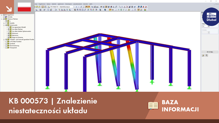 Aby znaleźć błędy modelowania w układzie konstrukcyjnym, program RFEM oferuje kilka eleganckich opcji ich lokalizacji i analizy. W tym celu w module RF ‑ STABILITY zaimplementowano również funkcję: Opcja "Obliczyć kształt wyboczeniowy dla modelu niestatecznego, aby można było sprawdzić graficznie przyczyny niestateczności" umożliwia obliczenie przypuszczalnie niestabilnych układów konstrukcyjnych. Na podstawie danych modelu moduł przeprowadza analizę wartości własnych, dzięki czemu wynik niestateczności elementu konstrukcyjnego, na który ma to wpływ, jest przedstawiony graficznie. Ta metoda jest szczególnie przydatna do znajdowania na przykład prętów, które nie są połączone lub mają zbyt wiele otwartych stopni swobody.