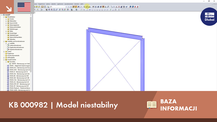 Wird trotz Beachtung der oben aufgeführten Punkte eine Instabilität ausgegeben, so liegt vermutlich eine fehlerhafte Modellierung vor. Es sollte dann unter "Extras" → "Modellkontrolle" überprüft werden, ob doppelte Knoten, überlappende Linien/Stäbe/Flächen oder kreuzende, nicht verbundene Linien/Stäbe vorhanden sind. Speziell bei importierten Systemen kommt es häufig vor, dass die Elemente aufgrund von Rundungsungenauigkeiten nicht verbunden sind. Auch die Randbedingungen wie Gelenke und Lager sollten kontrolliert werden.