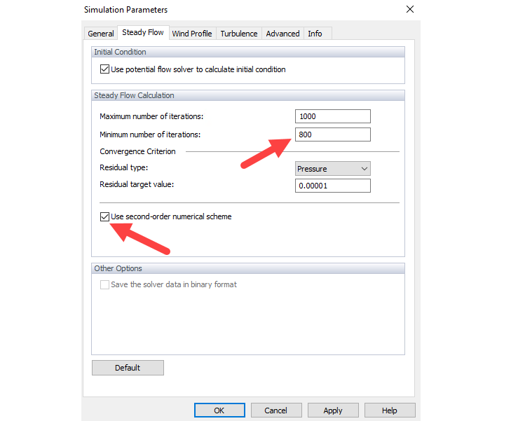 Aby numerycznie określić równania różniczkowe cząstkowe, wszystkie wyrażenia różniczkowe (pochodne przestrzenne i czasowe) muszą zostać dyskretyzowane. Istnieje szeroki wachlarz metod dyskretyzacji z różnymi podejściami pod względem dokładności, stabilności i zbieżności. Ogólnie rzecz biorąc, rząd dyskretyzacji ilustruje, jak dokładna jest symulacja numeryczna w porównaniu do rozwiązań oryginalnych, niedyskretyzowanych równań. Dyskretyzacja numeryczna pierwszego rzędu zasadniczo generuje lepszą zbieżność niż schemat drugiego rzędu. W bieżącym badaniu używana jest dyskretyzacja drugiego rzędu. Ponadto, podczas używania numerycznego schematu drugiego rzędu, zalecamy zwiększenie minimalnej liczby iteracji, aby osiągnąć lepszą zbieżność (Obraz 03).