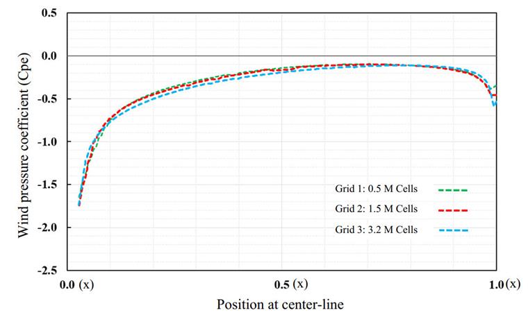 Wyniki w symulacji CFD są wrażliwe na rozmiar siatki, dlatego niezależność od siatki powinna być realizowana dla co najmniej trzech różnych liczebności elementów siatki. Oto wyniki wartości Cp na linii środkowej dachu; jak można zauważyć, występują bardzo niewielkie różnice, które pokazują, że wyniki symulacji wiatru stają się niezależne od trzeciej siatki (Obraz 08).