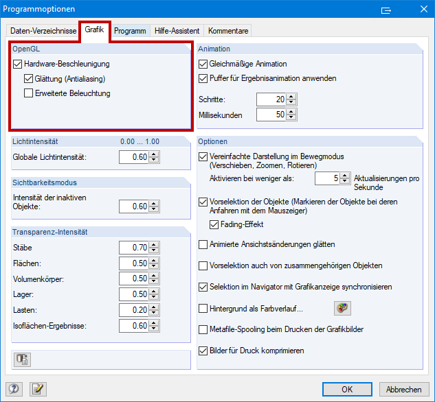 In RSTAB und RFEM können Sie die Hardware-Beschleunigung (OpenGL) über das Menü "Optionen" → "Programmoptionen" im Dialogregister "Grafik" aktiviert bzw. deaktiviert werden (siehe Bild 02). Im gleichen Dialog kann eine verbesserte Glättung (Antialiasing) eingestellt werden, um den Kanteneffekt zu unterbinden. Diese Optionen werden nach einem Neustart des Programms aktiviert.