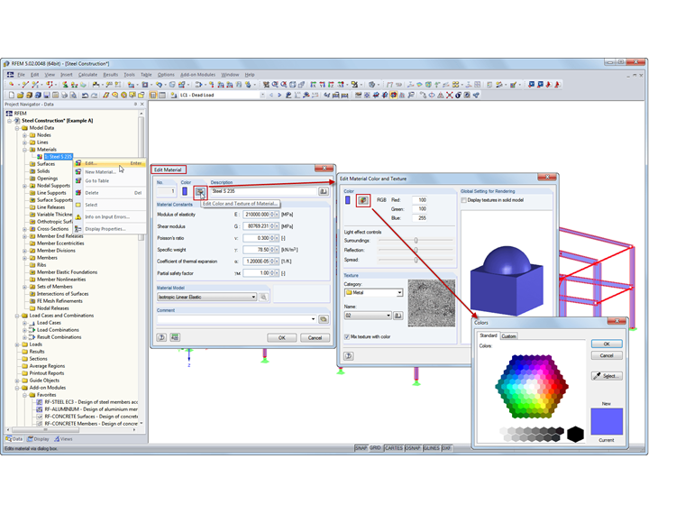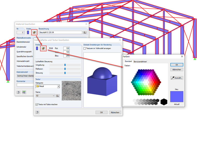 Um die Farbe eines Materials umzustellen, muss zuerst der Dialog Material bearbeiten geöffnet werden. Dort kann über das Betätigen der Schaltfläche [Materialfarbe und -textur bearbeiten] der Dialog mit weiteren Farben geöffnet werden. Wird dem Material eine andere Farbe zugewiesen, so werden alle Strukturteile, denen dieses Material zugeordnet wurde, im Rendering entsprechend andersfarbig dargestellt.