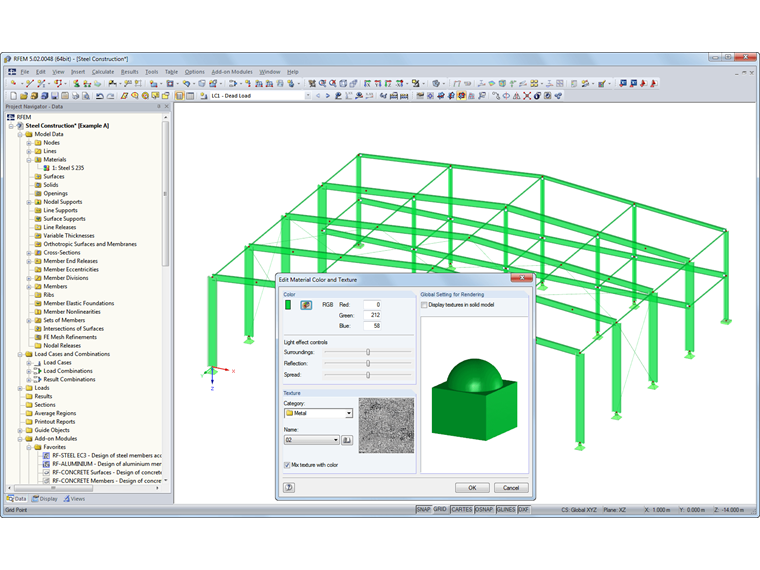 W programach RFEM i RSTAB można zapisywać zdefiniowane przez użytkownika kolory dla materiałów. Dadurch ändert sich die farbliche Darstellung des Vollmodells.