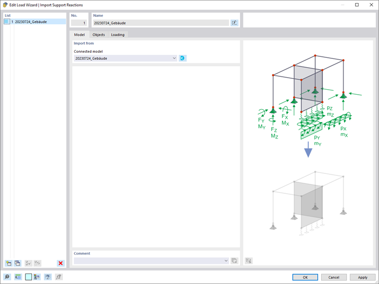 Wenn die Voraussetzungen erfüllt sind, kann im aktuellen Modell ("Kind"-Modell) der Lastassistent "Lagerreaktionen übernehmen" gewählt und dort im Reiter Modell das verbundene Modell ("Mutter"-Modell) zugewiesen werden (Bild 01).