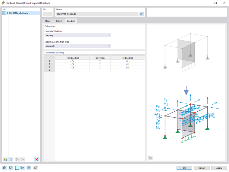 Im Reiter Belastung kann schließlich die Zuordnung der Lastfälle und die zu übernehmenden Lastrichtungen ausgewählt werden. Bild 03 zeigt eine reine Übernahme der vertikalen Lasten in den Lastfällen 1-3.
