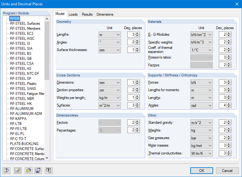 W jednym ogólnym oknie dialogowym określa się jednostki dla danych początkowych, obciążeń i wyników programu RFEM/RSTAB oraz wszystkich modułów dodatkowych.