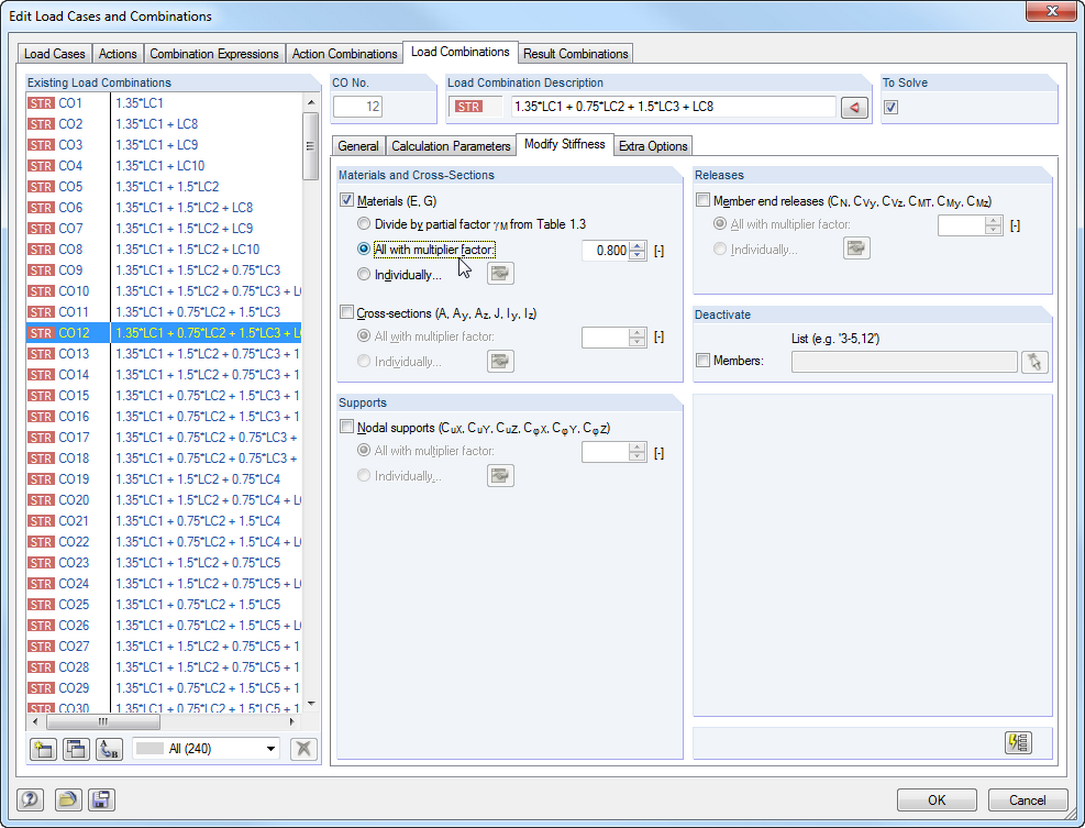 Dla poszczególnych przypadkach obciążeń lub ich kombinacji istnieje możliwość modyfikacji sztywności materiałów, przekrojów, podpór węzłowych, liniowych i powierzchniowych, a także przegubów prętowych i przegubów liniowych dla wszystkich lub wybranych elementów. Ponadto możliwe jest uwzględnienie deformacji z innego przypadku obciążenia lub kombinacji obciążeń jako stanu początkowego układu.
