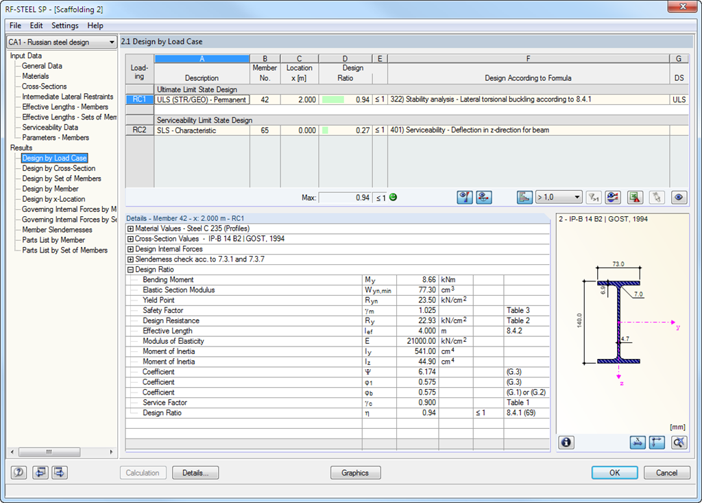 Pierwsza tabela przedstawia maksymalne stopnie wykorzystania wraz z odpowiednim wykorzystaniem dla każdego obliczanego przypadku, grupy i kombinacji obciążeń.