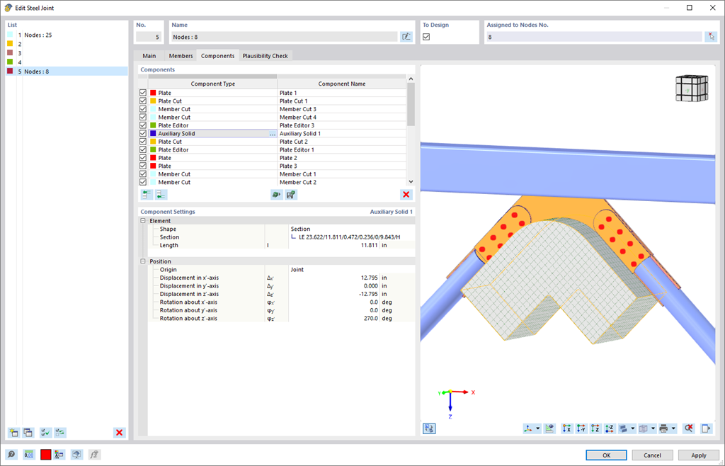 W rozszerzeniu Połączenie stalowe można użyć elementu "Bryła pomocnicza", aby dokładnie ciąć płyty i inne elementy konstrukcyjne. W ramach tego elementu, rolę obiektu pomocniczego mogą pełnić kształty takie jak sześcian, walec lub dowolny przekrój.