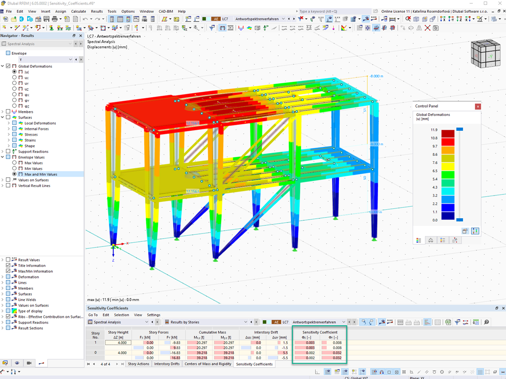 W przypadku analizy spektrum odpowiedzi modeli budynków można wyświetlić współczynniki wrażliwości dla kierunków poziomych według kondygnacji.