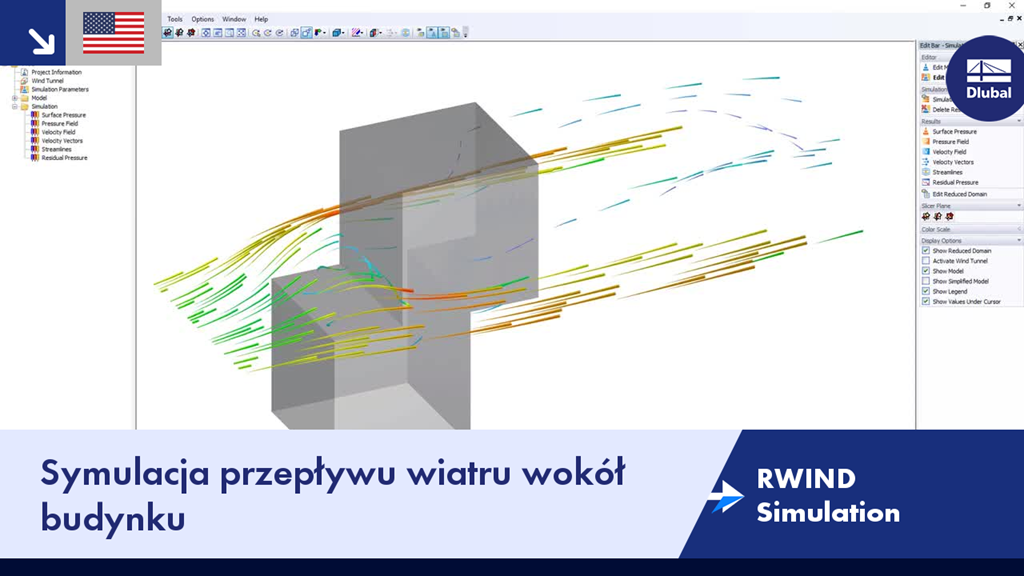 RWIND Simulation jest samodzielnym programem do symulacji CFD przepływu wiatru wokół budynków lub innych obiektów i generowania obciążeń wiatrem, czyli sił działających na te obiekty. Napór i ssanie wiatru mogą być importowane jako obciążenia do programów do analizy statyczno-wytrzymałościowej RFEM lub RSTAB.