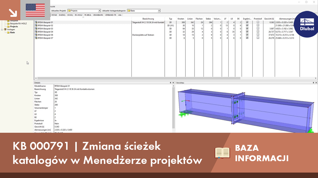 Menedżer projektów z możliwością pracy w sieci kontroluje projekty wszystkich aplikacji firmy Dlubal w jednym miejscu. Projekty są powiązane z folderami na dysku twardym.