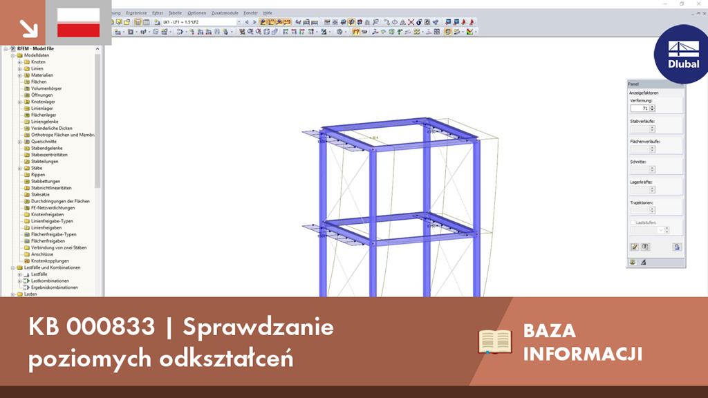 Aby kontrolować przemieszczenia boczne modelu, można użyć modułu dodatkowego RF-/LIMITS. Ten moduł dodatkowy umożliwia na przykład przeprowadzenie analizy stanu granicznego użytkowalności w celu znalezienia poziomych deformacji węzłowych i zestawienia ich z wartością graniczną.
