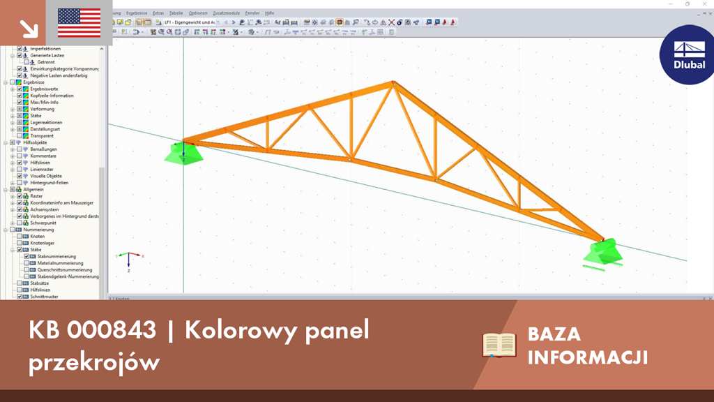 Aby uzyskać szybki przegląd zastosowanych przekrojów, można wyświetlić pręty w kolorze posortowane według przekroju. Za pomocą prawego klawisza myszy w oknie roboczym wybierz z menu kontekstowego "Kolory w grafice według" → "Przekroje". W obecnych wersjach programu można do tego użyć panelu z edytowalną skalą kolorów.