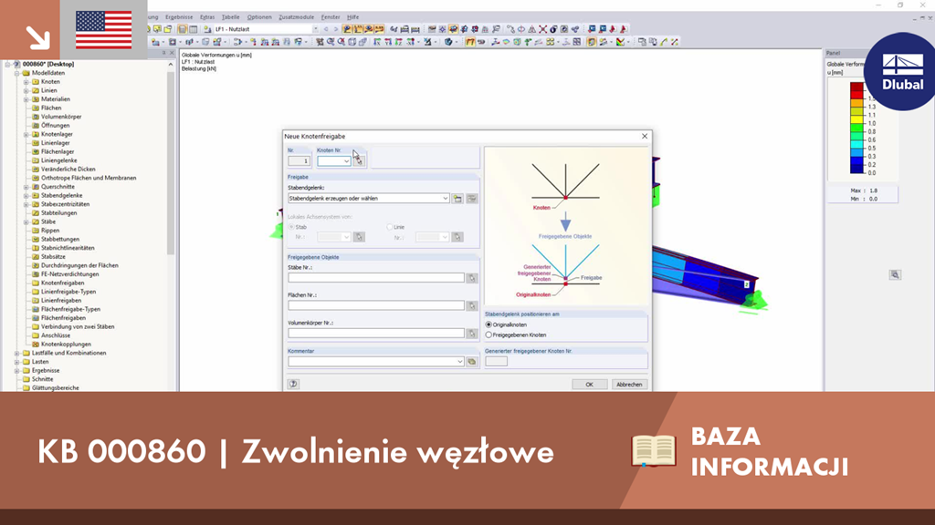 Czasami w modelu należy uwzględnić, że niektóre belki leżą luźno jedna na drugiej, bez skręcania śrubami lub spawania. W programie RFEM 5 można łatwo spełnić ten warunek, stosując zwolnienie węzłowe. W tym celu należy zdefiniować zwolnienie z żądanym stanem zwolnienia w odpowiednim węźle w oknie dialogowym Zwolnienie węzłowe. Przykład pokazany na rysunku odpowiada temu, w którym zwolnienie siły tnącej jest stałe i Vz dodatnie. W przypadku podniesienia ciężaru następuje rozłączenie obu prętów.