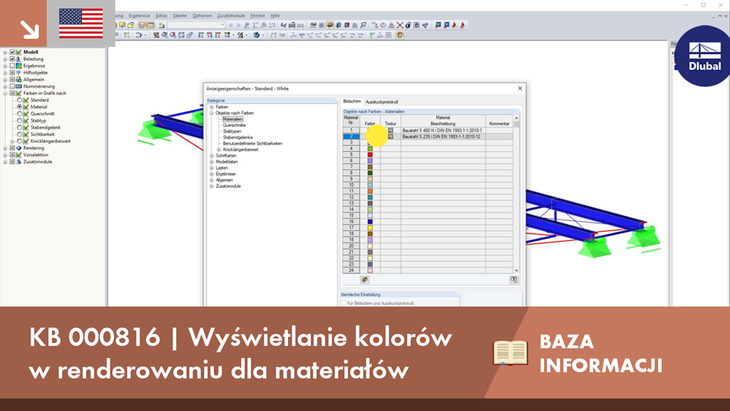 W programach RFEM i RSTAB można wizualnie sprawdzić lub wyświetlić materiały użyte na pręty w modelu szkieletowym i bryłowym.