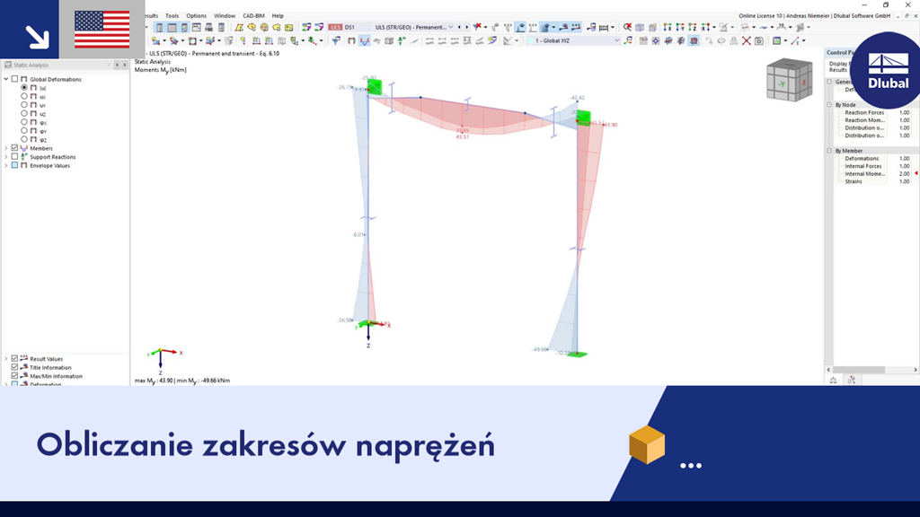 Ten film pokazuje obliczanie zakresów naprężeń na podstawie podejścia dla różnych sytuacji obciążeniowych. Zadanie to można wykonać w programie RFEM 6 lub RSTAB 9 za pomocą rozszerzenia "Analiza naprężeń i odkształceń", w którym należy podać pręty, które mają zostać przeanalizowane.