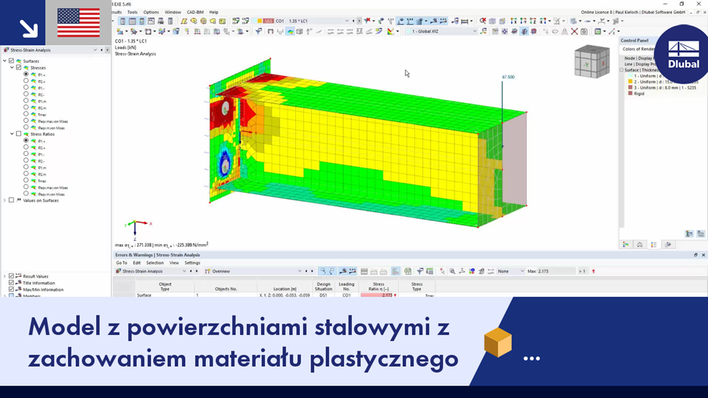 W tym celu aktywowano rozszerzenie „Nieliniowe zachowanie materiału”. Do powierzchni przypisany jest izotropowy model materiału plastycznego. Wyniki należy przesunąć za pomocą opcji „Stałe na elementach siatki”.