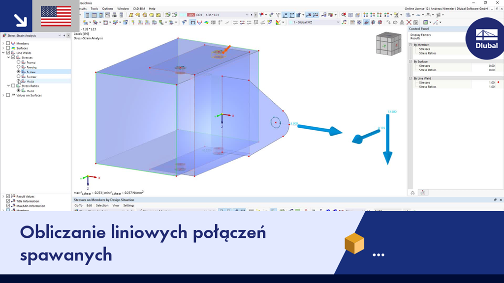 W tym filmie pokazano obliczanie połączeń spoin liniowych. Zadanie to wykonuje się w programie RFEM 6 za pomocą rozszerzenia do analizy naprężeniowo-odkształceniowej, wraz z określeniem geometrii spoiny i naprężenia granicznego w spoinie.
