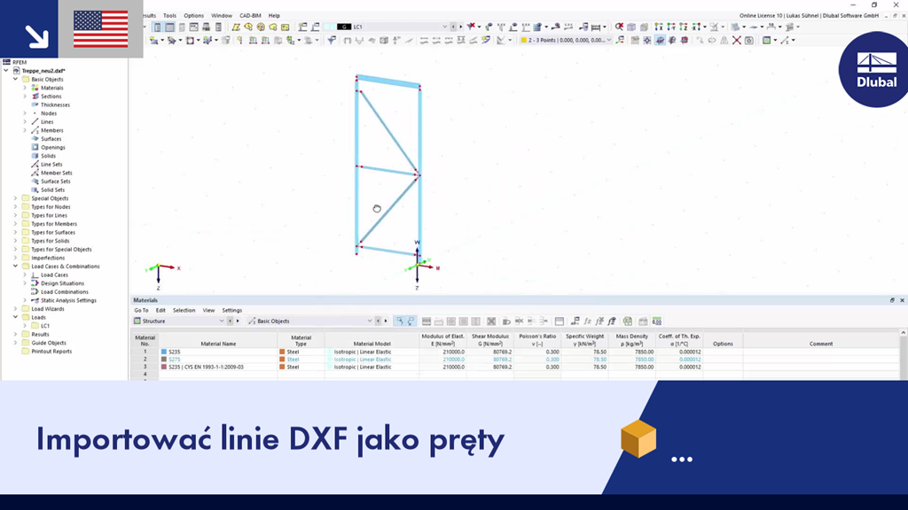 W tym filmie pokazano import pliku DXF. Opis warstw zawiera profil i nazwę materiału. Program RFEM korzysta z informacji uzyskanych podczas importu, aby przekonwertować linie na pręty.