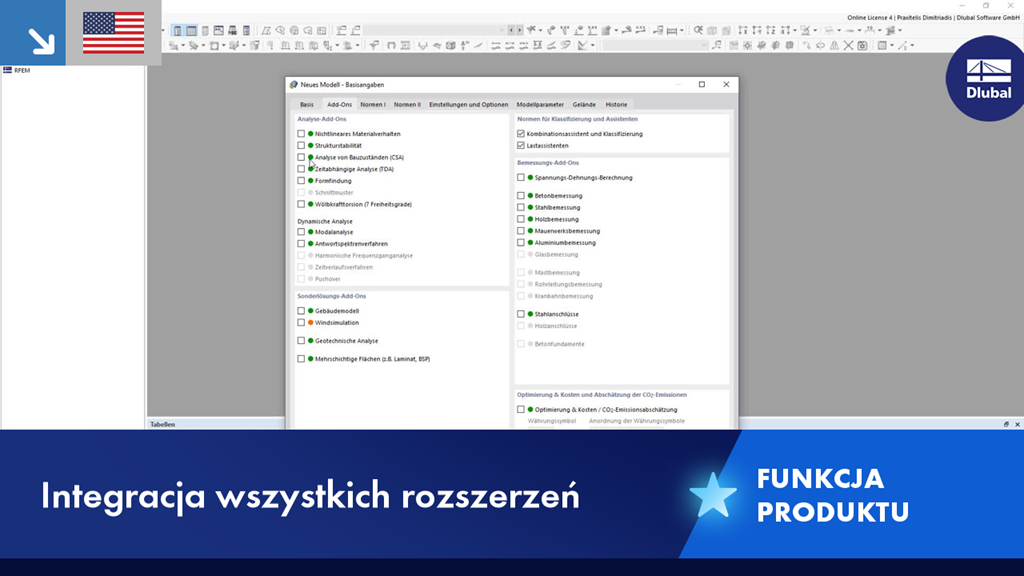 Wszystkie rozszerzenia są zintegrowane z programami RFEM 6 lub RSTAB 9. Umożliwia to interakcję między poszczególnymi częściami programu np. określenie idealnego momentu krytycznego dla belek drewnianych w rozszerzeniu "Skręcanie skrępowane (7 stopni swobody)" lub uwzględnienie etapowania w przypadku form-finding w rozszerzeniu "Analiza etapów budowy".