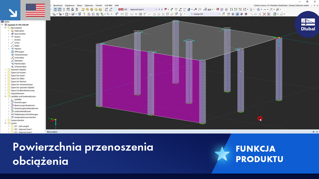 Powierzchnia o sztywności typu "Przenoszenie obciążenia" nie ma wpływu na zachowanie konstrukcji i wyniki. Można jej użyć do uwzględnienia obciążeń z powierzchni, które nie zostały zamodelowane (np. konstrukcje fasadowe, powierzchnie szklane, trapezowe profile dachowe itd.).