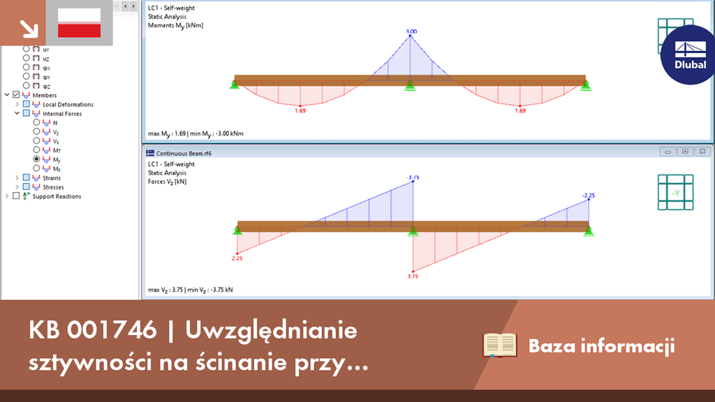 W tym filmie pokazano siły wewnętrzne i przemieszczenia belki ciągłej obliczone zarówno z uwzględnieniem sztywności na ścinanie, jak i bez niej.
