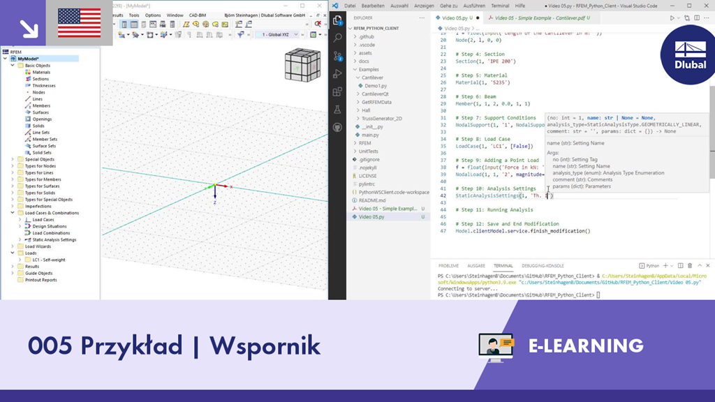 Witamy ponownie w piątym filmie z serii "Programowanie w RFEM 6 i Python". Posiadając niezbędną podstawową wiedzę, jesteśmy w stanie wykonać kilka prostych przykładów. Najpierw modelujemy wspornik z obciążeniem węzłowym.