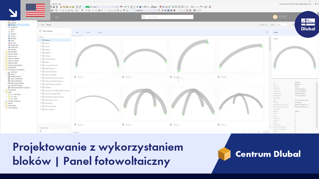 W tym filmie pokażemy, jak zaimportować blok panelu fotowoltaicznego i ustawić jego parametry, takie jak wymiary, przypisanie przekrojów stalowych i obciążenia.