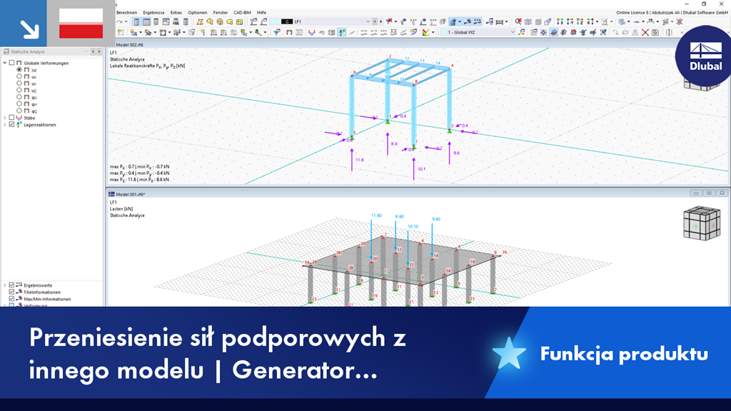 Przenoszenie obciążeń z przypadków obciążeń i kombinacji obciążeń może odbywać się automatycznie lub ręcznie. Modele należy zapisać w tym samym projekcie Dlubal Center.