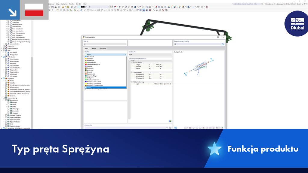 Typ pręta "Sprężyna" służy do symulacji liniowych i nieliniowych właściwości sprężystości za pomocą obiektu liniowego. Funkcja ta pomaga w modelowaniu sztywności w jednostce siła/przemieszczenie.