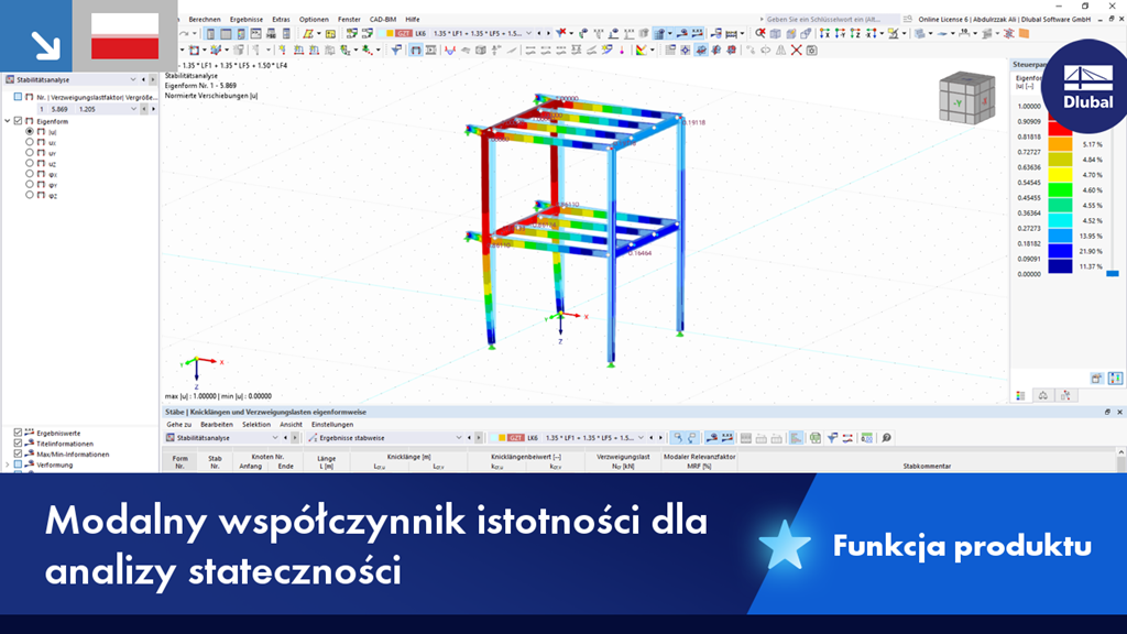 Stosując modalny współczynnik istotności (MRF) można ocenić, w jakim stopniu poszczególne elementy konstrukcyjne przyczyniają się do powstania rzeczywistego kształtu wyboczenia. Obliczenia opierają się na energii względnego odkształcenia sprężystego każdego pojedynczego pręta.