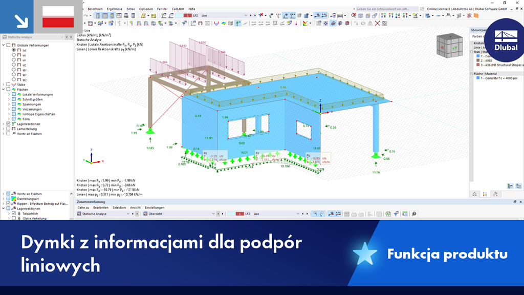 W przypadku wyników podpór liniowych można opcjonalnie wyświetlić w dymkach informacje dodatkowe, takie jak opis, suma, średnia wartość itp.