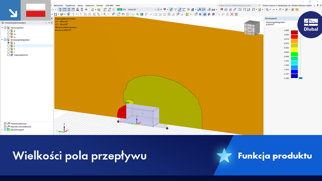 W programach RFEM i RSTAB można zwizualizować wartości ciśnienia, prędkości, energii kinetycznej turbulencji oraz prędkości dyssypacji energii turbulencji dla symulacji wiatru.