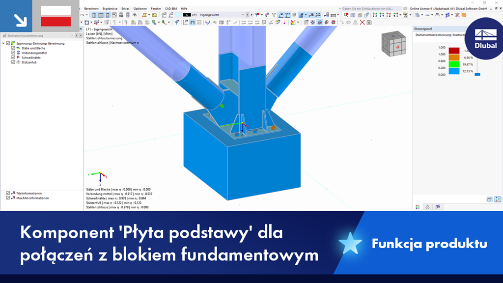 Komponent "Płyta podstawy" umożliwia wymiarowanie połączeń z płytą podstawy za pomocą kotew zabetonowanych. Analizie poddawane są płyty, spoiny, zakotwienia oraz interakcja stal - beton.