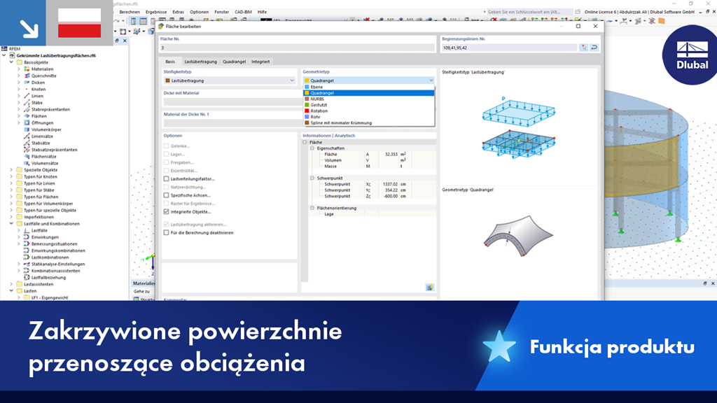 W przypadku sztywności powierzchni typu "Przeniesienie obciążenia" oprócz geometrii dostępne są również zakrzywione geometrie, takie jak "Czworobok", "NURBS", "Obrót", "Płaszczyzna" i "Rura".