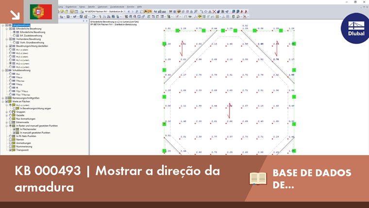 No RFEM 5 também é possível ativar a visualização da direção da armadura. Zum Einen kann die Bewehrungsrichtung mittels der Anzeige des Bewehrungspfeils eingeblendet werden und zum Anderen besteht die Möglichkeit, die angezeigten Ergebniswerte für die Bewehrung in die Richtung der angezeigten Bewehrung auszurichten.