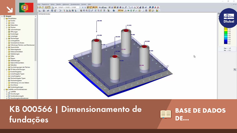 Para o dimensionamento da placa de fundação, utilizamos o RF -CONCRETE Surfaces para a verificação da flexão e a verificação da largura da fenda. As bases ascendentes podem ser dimensionadas com o RF -CONCRETE Members. O dimensionamento ao punçoamento das bases individuais na placa é realizado com o RF -PUNCH. As verificações geotécnicas podem ser realizadas manualmente através da saída da pressão de apoio existente. Com o RF -SOILIN, pode introduzir os parâmetros do solo a partir de um relatório de investigação do solo para determinar os coeficientes de fundação e considerá -los no cálculo do RFEM.